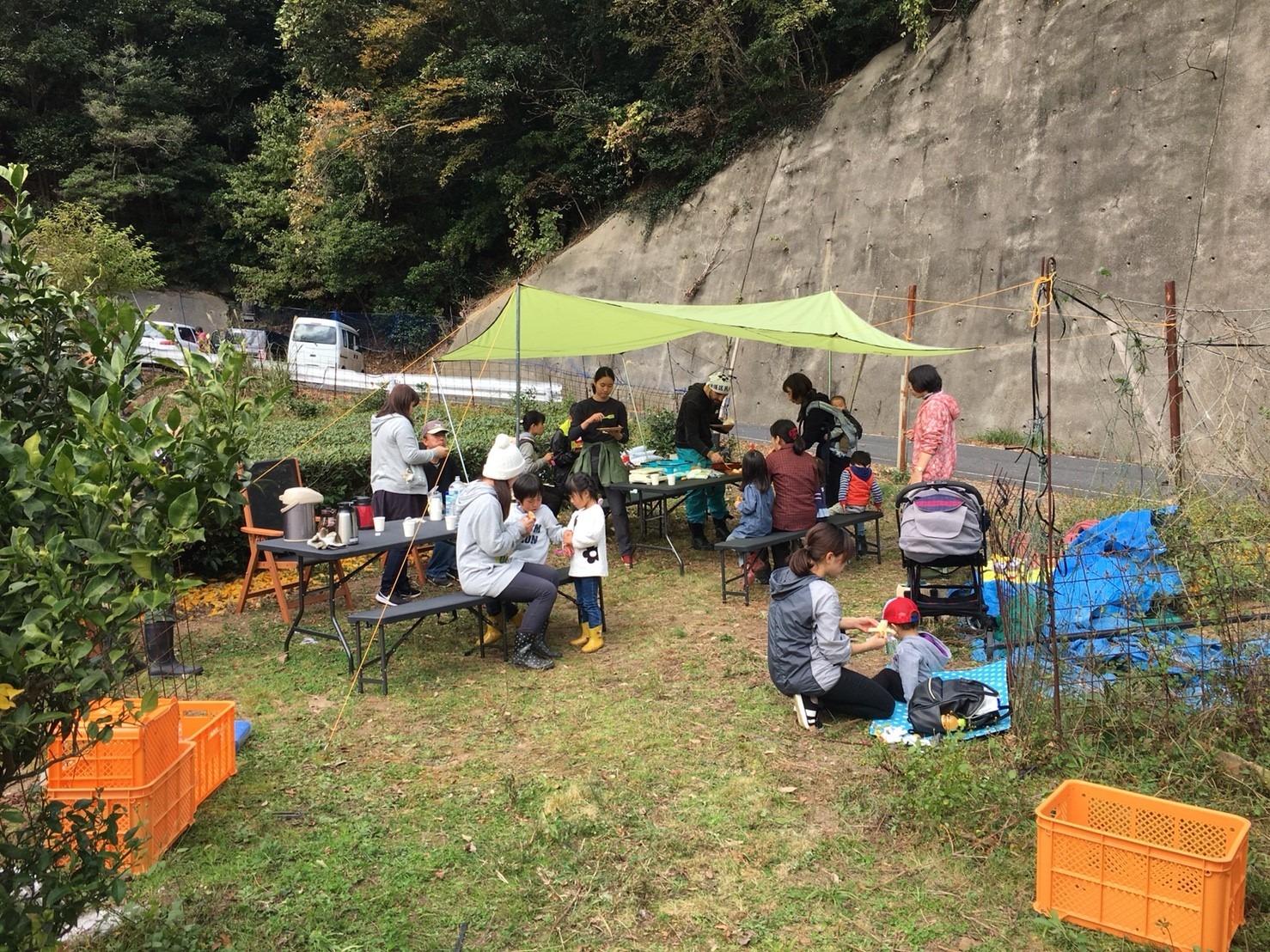 収穫の後はタープの下で休憩タイム。